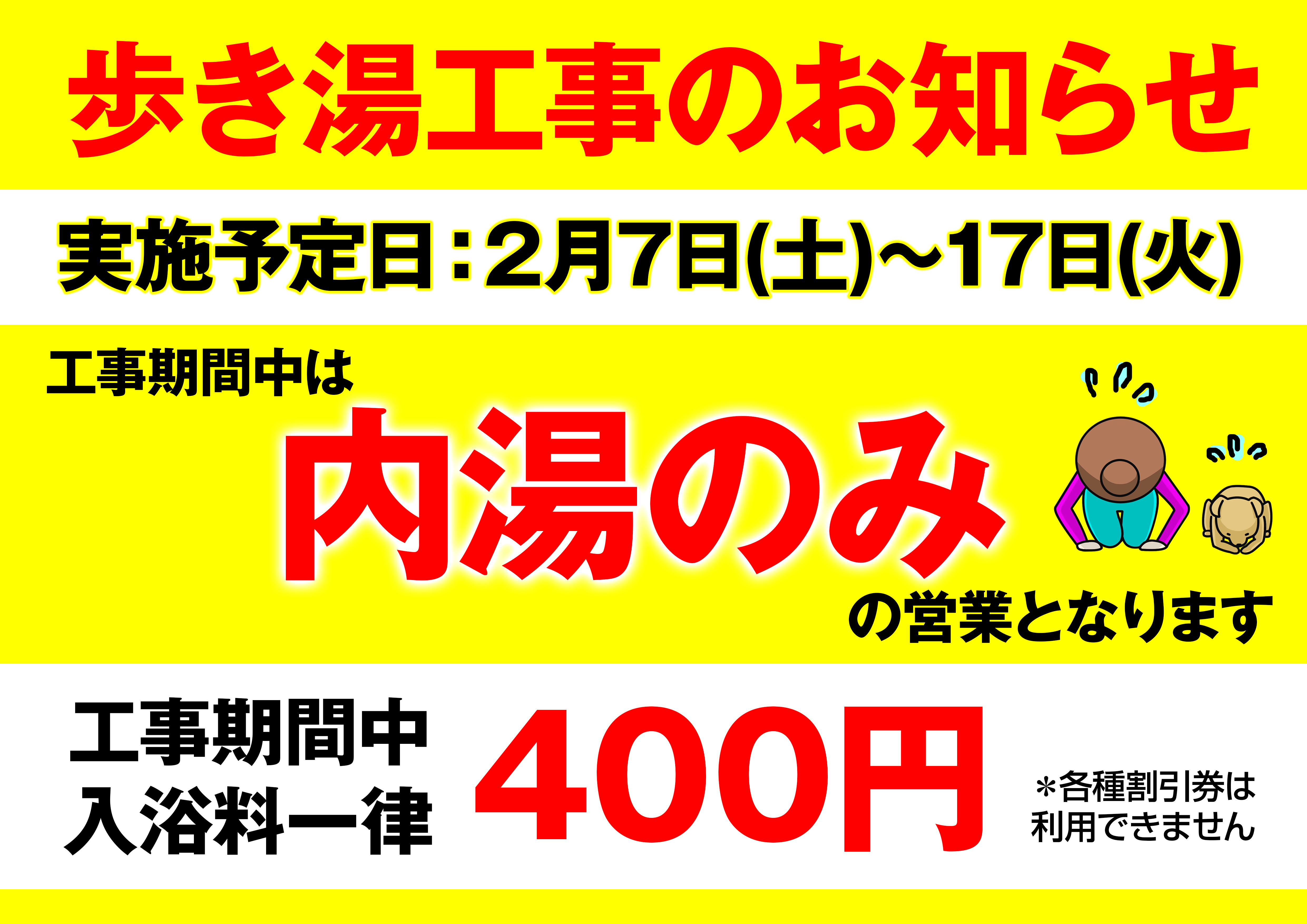 平素は格別のお引き立てを賜り誠にありがとうございます。 温泉棟施設内工事に伴い、2026年2月7日(土)~19日(木)まで、バーデゾーン(水着着用エリア)をご利用いただけません。 ご利用を予定されていたみなさまには、大変申し訳ございません。 期間中は、「内湯のみ」ご利用可能です。 日帰り温泉の入浴料は400円でございます。 【工事期間中にご宿泊の皆様へ、2つのお知らせでございます。】 (1)期間中、御前湯の温泉無料券をお配りいたします。(クアパーク長湯から車で約5分、徒歩で約20分です) (2)宿泊料金は通常より10%安い価格から販売しております。 ただし、お部屋が埋まってまいりますと料金が高くなるダイナミックプライシングを実施しています。 お客様にはご迷惑をお掛けいたしますが、何卒よろしくお願いいたします。